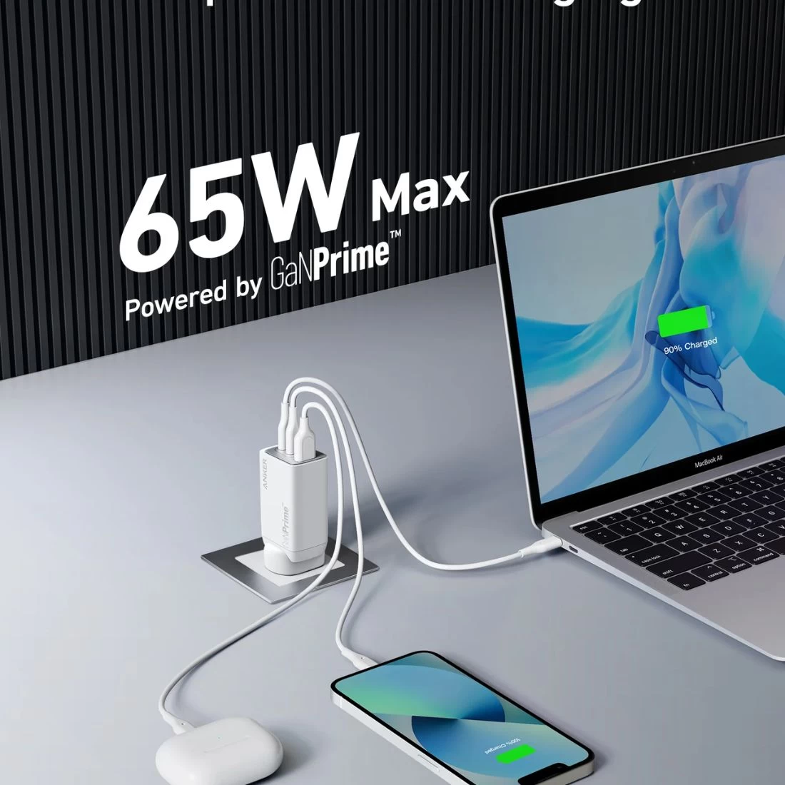 With 2 USB-C ports and one USB-A port, you can charge your phone, notebook, and earbuds all at once from a single charger. Connect a single device to charge at up to 65W. - Charge Up to 30 Minutes Faster
