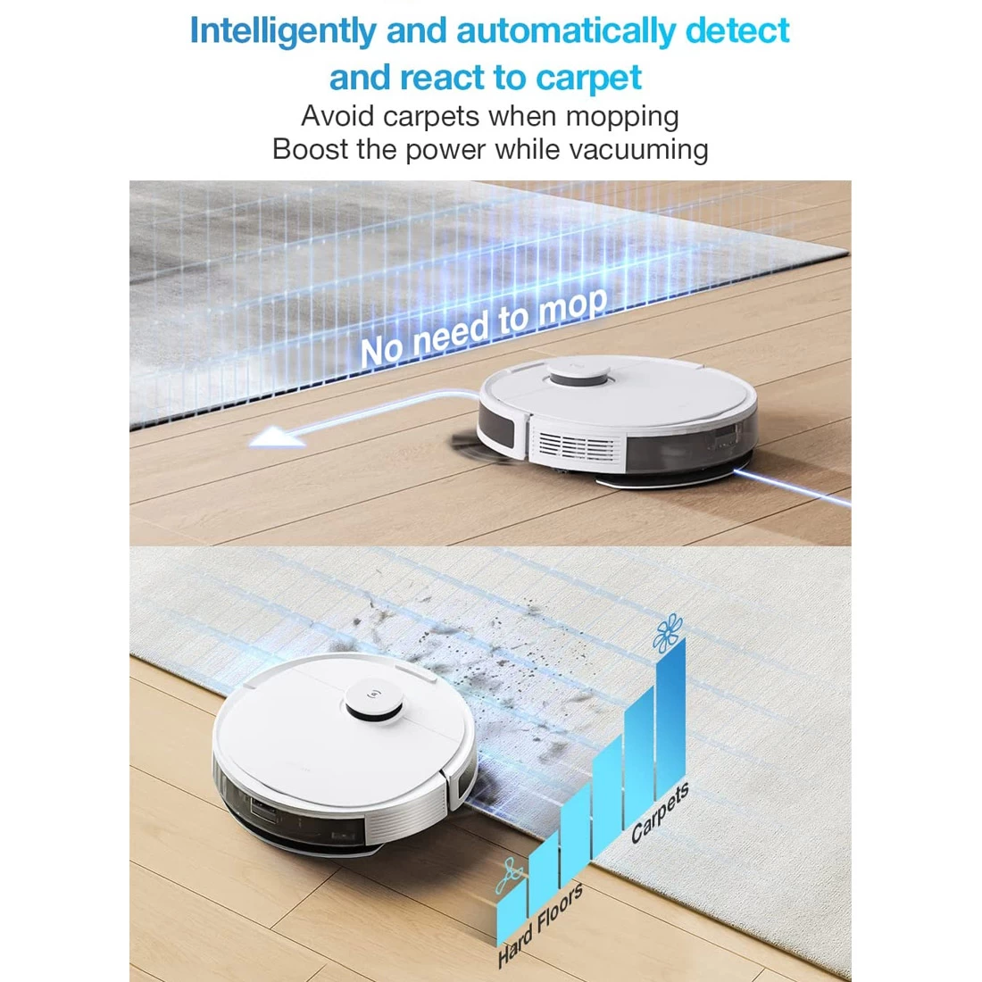 With the OZMO mopping system, the DEEBOT N8 can simultaneously vacuum and mop. The innovative technology allows you to set four moisture levels for different needs and floor types, such as laminate, wooden floors or tiles – conveniently via the app. - Powerful vacuuming and removal of dust even on carpets