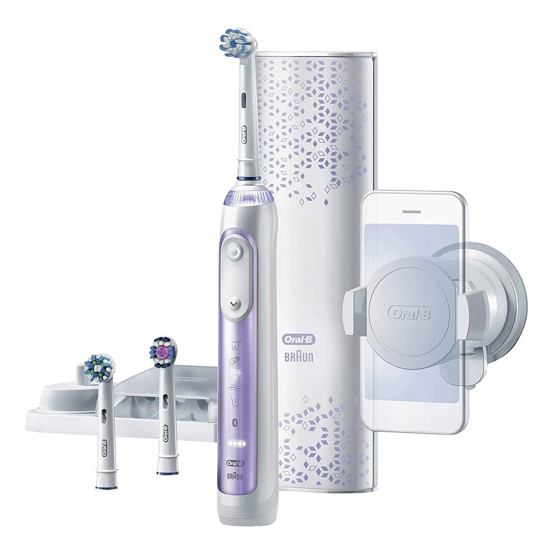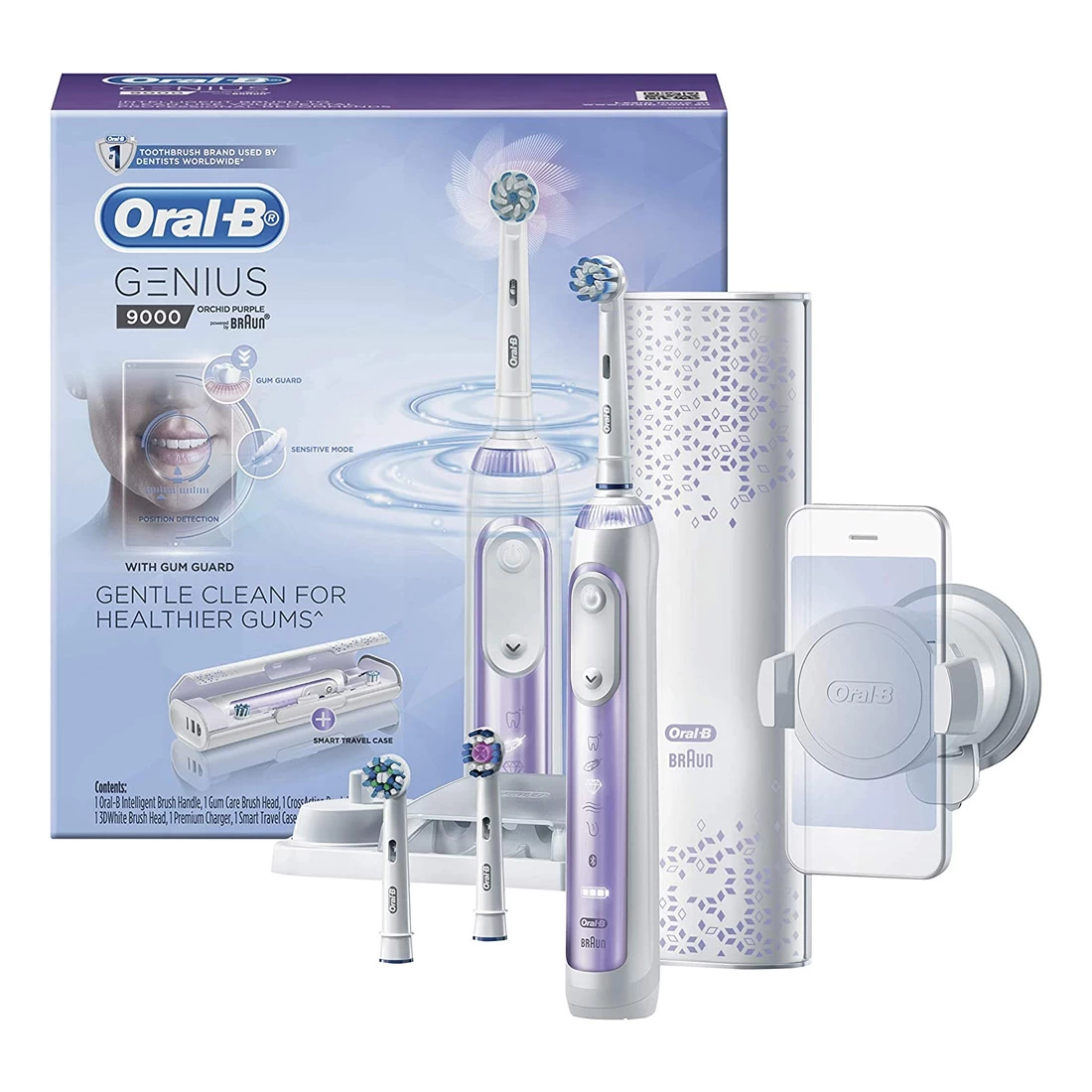 - Contents: 1 Genius 9000 Orchid Purple Bluetooth-Connected Handle (6 modes), Smart Travel Case, Charging Station, Smartphone Holder, 3 Toothbrush Heads