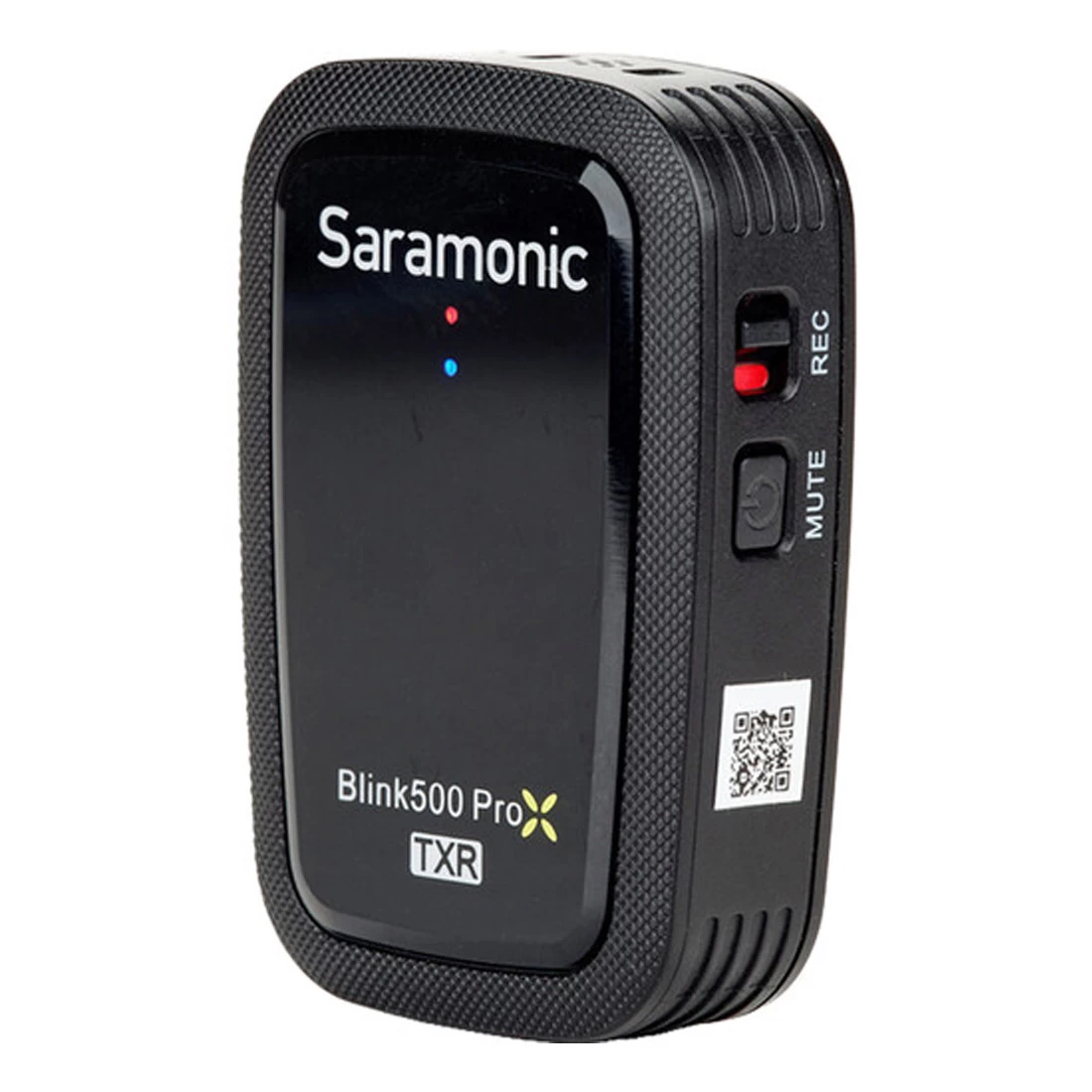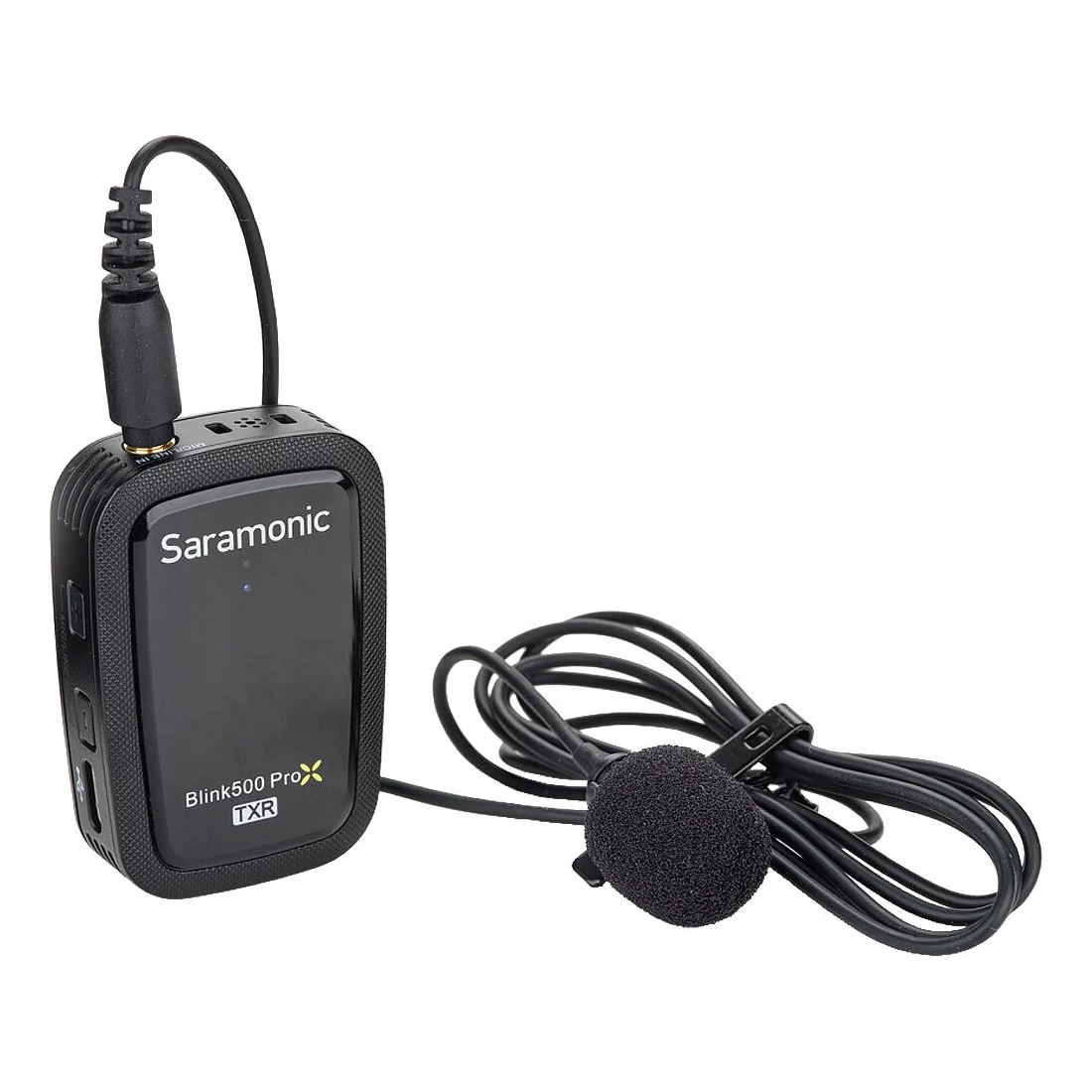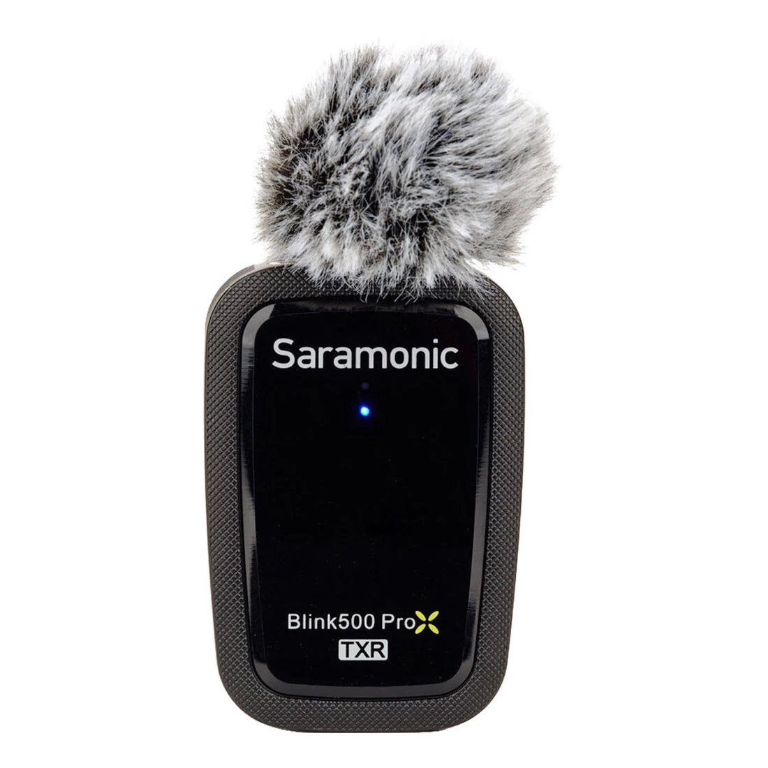 - The Blink 500 ProX TXR from Saramonic is a miniature clip-on microphone/transmitter with onboard recording function available as an individual component to expand your existing wireless setup or for use as a backup transmitter. When used with a Blink 500 ProX RX, RXDi, or RXUC receiver (all available separately), the system offers an ultracompact solution that lets you record one or two wireless mics to cameras and smartphones (depending on the receiver used).