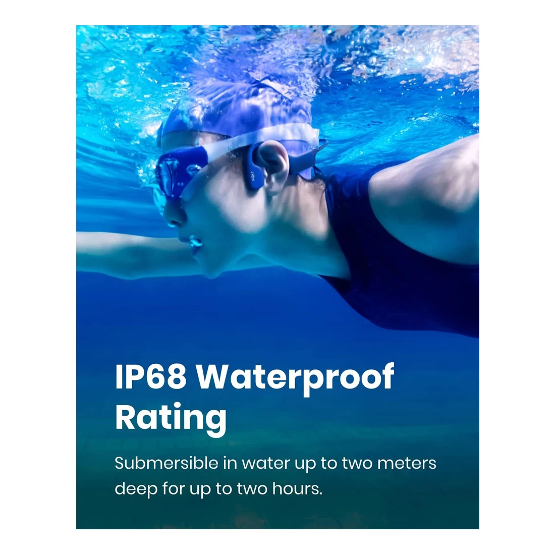 Our open-ear design powered by bone conduction technology ensures bud-free, comfortable listening all day, in or out of the water. - IP68 Waterproof