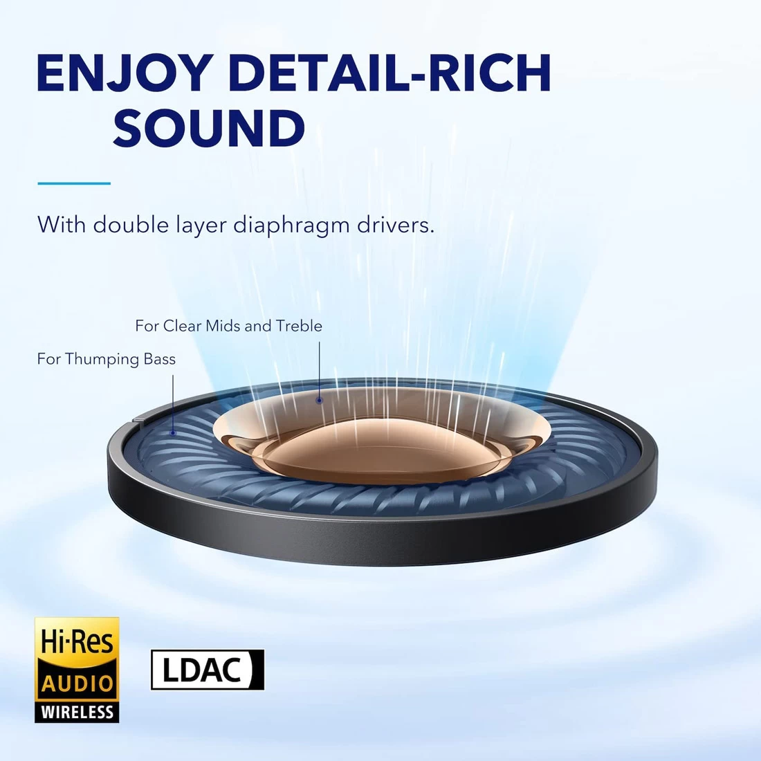 Space A40 earbuds have soundcore’s pioneering double-layer diaphragm drivers to deliver sound with strong bass, clear mids, and bright treble. - Hi-Res Listening Experience